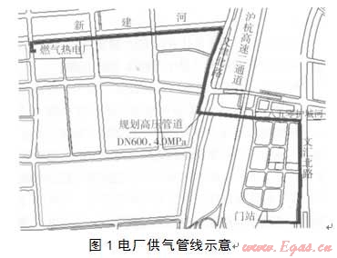 由于城市門(mén)站直線(xiàn)距離電廠不足3kin,管線(xiàn)距離僅4.5km,為此電廠所需天然氣從市門(mén)站接出,并用專(zhuān)線(xiàn)直供電廠??紤]到電廠二期擴(kuò)建及減少啟停和事故狀態(tài)下對(duì)天然氣管網(wǎng)的沖擊,管徑選擇為DN600。但是目前的城市門(mén)站只能滿(mǎn)足電廠一期工程的需要,為此一期供氣工程利用現(xiàn)狀高壓系統(tǒng),在現(xiàn)狀進(jìn)站總管設(shè)置三通后,經(jīng)計(jì)量(成撬設(shè)置)后直供電廠。同