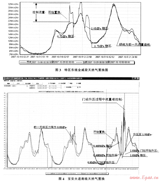 (3) 按有關規(guī)范的要求,置換時的流速應控制在5m/s。通過粗略計算將流速控制折算成流量控制,建立流量控制表,通過SCADA系統(tǒng)門站瞬時流量,結合前一天的流量曲線,算出增量,將增量與流量控制表對比,及時通知現(xiàn)場進氣閥門操作人員進行調(diào)整。將流量控制在規(guī)范范圍。同時也保證了流量較為平穩(wěn),將對上游的影響降到最低。