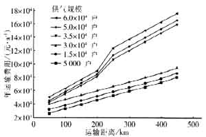 ②年運輸費用隨運輸距離線性變化,當供氣規(guī)模在3×1O4戶以下時,斜率較小;當供氣規(guī)模在3.5×104戶以上時,斜率較大,且在200 km和250km之間有一轉(zhuǎn)折。斜率差異主要是因為目前LNG汽車槽車型號少(國內(nèi)常用的LNG槽車容積主要為30 m3、40m3和45 m3),3×104戶以下供氣規(guī)模的氣化站每天所需的用氣量,單輛槽車每天運輸一次即能滿足。供氣規(guī)模超過3×104戶后,單輛槽車每天運輸2次或2輛槽車每天各運輸一次才能滿足氣化站每天所需的用氣量。出現(xiàn)轉(zhuǎn)折主要是因為建模過程中考慮到運輸安全性,規(guī)定槽車的行駛速度為70 km/h且單輛槽車每天在路上行駛的時間不超過13 h,因此當運輸距離超過200km后,氣化站每天所需的用氣量由原先的單輛槽車每天運輸2次來滿足變?yōu)?輛槽車每天各運一次來滿足,從而年運輸費用中的槽車年折舊費用、保險費用等增加。