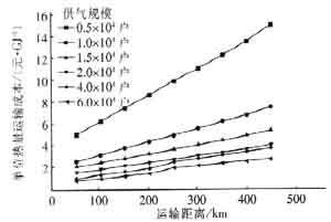 ?、?LNG供氣經(jīng)濟性良好,供氣成本在2.15~2.77元/m3內(nèi)變化。但對于15×1O4戶以下的供氣規(guī)模不適合遠距離運輸,因為隨著運輸距離的增加,這些規(guī)模的供氣成本增加較大。