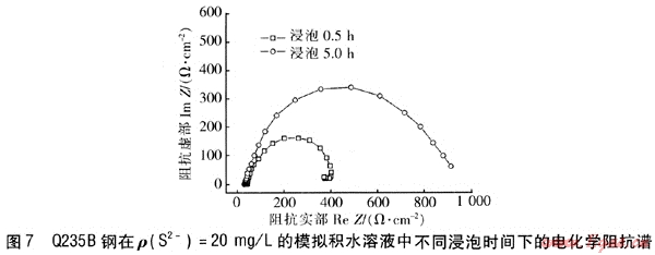 圖7為Q235B鋼在ρ(S2-)=20mg/L的模擬積水溶液中分別浸泡0.5h和浸泡5h所得的電化學(xué)阻抗譜。由圖7可知,隨浸泡時(shí)間的不同,Nyquist圖的形狀有明顯不同。浸泡時(shí)間短時(shí),Nyquist圖由一個(gè)高頻容抗弧和一個(gè)低頻小感抗弧組成。當(dāng)浸泡時(shí)間由0.5h增大到5h時(shí),Nyquist圖表現(xiàn)為一個(gè)大容抗弧,低頻感抗弧已經(jīng)消失,且大容抗弧的半徑顯著變大,即其阻抗增大。說明在模擬積水溶液中,隨著浸泡時(shí)間的延長,S2-對(duì)Q235B鋼表面電化學(xué)反應(yīng)的抑制作用增強(qiáng)。