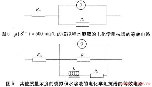根據(jù)Q235B鋼在該腐蝕體系中的阻抗譜特征,應(yīng)用圖5和圖6所示的等效電路對(duì)圖3中的EIS數(shù)據(jù)進(jìn)行擬合,圖5為ρ(S2-)=500mg/L的模擬積水溶液的電化學(xué)阻抗譜的等效電路,圖6為其他質(zhì)量濃度模擬積水溶液的電化學(xué)阻抗譜的等效電路。