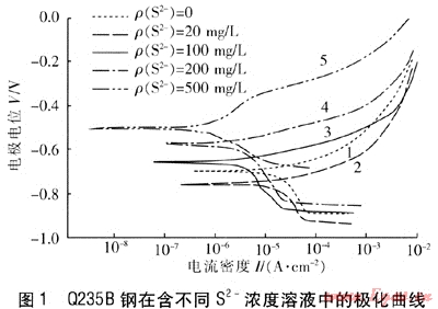 ① 溶液中的S2-添加至20mg/L的過程中,Q235B鋼的腐蝕電位降低。根據(jù)腐蝕電化學(xué)理論[9],酸性含硫體系的腐蝕電位應(yīng)處于陽極Fe的溶解和陰極H+的還原電位間的某一混合電位下。而加入Na2S,水解生成H2S,對(duì)鐵的可逆電位產(chǎn)生影響,使得其腐蝕電位下降。②隨著S2-質(zhì)量濃度的繼續(xù)增加,Q235B鋼的腐蝕電位明顯升高。這是由于陽極氧化,反應(yīng)受到抑制的結(jié)果。S2-質(zhì)量濃度的增加使陽極表面形成大量硫化物覆蓋在電極表面,使鐵離子進(jìn)入溶液產(chǎn)生更大的阻力,所產(chǎn)生的電壓降也更大,使得電極電位升高[10]。