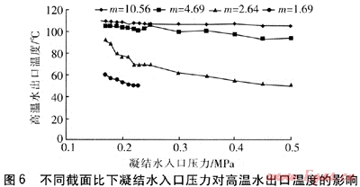 不同截面比下凝結(jié)水入口壓力對(duì)高溫水出口溫度的影響見(jiàn)圖6。高溫水出口溫度取決于引射蒸汽量和凝結(jié)水流量,是考察引射混合式低壓加熱器加熱性能的重要指標(biāo)之一。由圖6可知,隨著截面比的改變,高溫水出口溫度變化較大。當(dāng)截面比m=1.69時(shí),高溫水出口溫度比其他3組試驗(yàn)值低。由圖4、5可知,在4組試驗(yàn)數(shù)據(jù)中,截面比m=1.69時(shí)的凝結(jié)水流量最大、引射蒸汽量最高,但增大的引射蒸汽量不足以抵消凝結(jié)水流量增大的影響,因此高溫水出口溫度最低。高溫水出口溫度最高的是截面比m=10.56的引射混合式低壓加熱器,高溫水出口溫度可達(dá)110℃。由此可知,對(duì)于引射混合式低壓加熱器性能的考察要全面,不能只關(guān)注引射蒸汽量,應(yīng)綜合考察其加熱性能,選擇合適的截面比,這樣才能獲得較高溫度的高溫水。