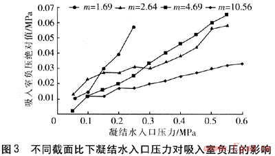 引射能力指引射混合式低壓加熱器對(duì)被引射蒸汽引射作用的強(qiáng)弱,吸入室負(fù)壓決定引射混合式低壓加熱器對(duì)蒸汽的引射能力,測(cè)試在不打開(kāi)蒸汽閥門的條件下進(jìn)行。不同截面比下凝結(jié)水入口壓力對(duì)吸入室負(fù)壓的影響見(jiàn)圖3。由圖3可知,吸入室負(fù)壓與凝結(jié)水入口壓力、截面比的關(guān)系密切。隨著凝結(jié)水入口壓力的增大,吸入室負(fù)壓在不斷增大。截面比m=4.69、凝結(jié)水入口壓力為0.55MPa時(shí),吸入室負(fù)壓可達(dá)到0.065MPa。由試驗(yàn)數(shù)據(jù)可知,吸入室負(fù)壓能夠有效消除凝結(jié)水沿汽輪機(jī)抽氣管道回流的壓力,伴隨著運(yùn)行工況的變化,吸入室負(fù)壓也會(huì)隨之改變,但是負(fù)壓一直存在,并對(duì)凝結(jié)水回流產(chǎn)生抑制作用,避免汽輪機(jī)發(fā)生事故。