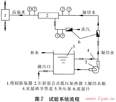 試驗(yàn)?zāi)M小型火電廠裝機(jī)容量為6MW的發(fā)電機(jī)組低壓加熱器的工況,被引射蒸汽壓力為0.18~0.20MPa,試驗(yàn)過(guò)程中調(diào)節(jié)凝結(jié)水入口壓力,變化范圍為0.04~0.60MPa。試驗(yàn)系統(tǒng)流程見(jiàn)圖2,溫度、壓力采集點(diǎn)緊鄰引射混合式低壓加熱器進(jìn)出口,確保采集結(jié)果接近實(shí)際。試驗(yàn)過(guò)程中溫度、壓力采用人工記錄與模塊化數(shù)據(jù)采集兩種方式。