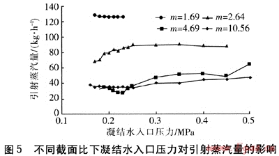不同截面比下凝結(jié)水入口壓力對(duì)引射蒸汽量的影響見(jiàn)圖5。由圖5可知,相同凝結(jié)水入口壓力, 不同截面比的引射混合式低壓加熱器引射蒸汽量不同,這是由于截面比的改變引起凝結(jié)水流量的變化。截面比小的,工作噴嘴出口直徑大,凝結(jié)水流量也大,產(chǎn)生的負(fù)壓及引射蒸汽量也大。