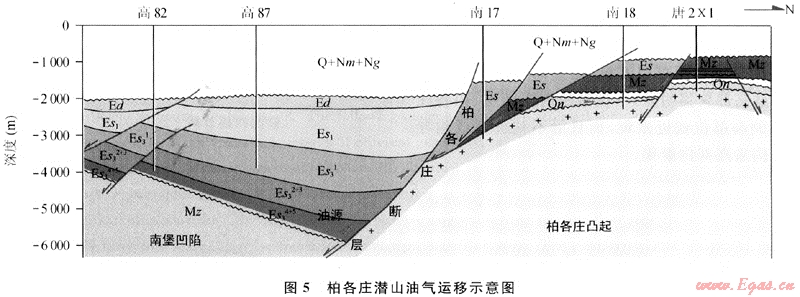 5) 下生上儲(chǔ)、新生古儲(chǔ)、油氣在構(gòu)造高部聚集成藏,構(gòu)造高部位是本區(qū)主要的油氣聚集帶。從以往的油氣勘探成果圖可以看出,南堡凹陷周邊地區(qū)油氣在構(gòu)造高部聚集明顯,不僅沿西南莊斷層、柏各莊斷層兩側(cè)高部位就近聚集,而且沿不整合面或輸導(dǎo)儲(chǔ)層向構(gòu)造高部位聚集。