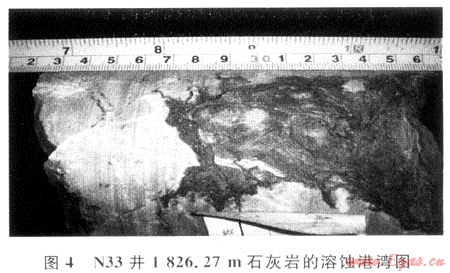 碳酸鹽巖是一種化學(xué)性較活潑的巖石,具有可溶蝕性,而且基本上貫穿其成巖作用的各個(gè)階段,只是溶蝕強(qiáng)度有明顯差異。該成巖作用常常導(dǎo)致孔、洞的大量發(fā)育,對(duì)改善儲(chǔ)層的儲(chǔ)集性能具有非常積極的意義。如南33井1826.27m奧陶系下馬家溝組巖心表面見有方解石充填物的溶蝕孔洞,洞徑約3×6mm,肉紅色石灰?guī)r邊緣還見溶蝕形成的港灣狀(見圖4)。