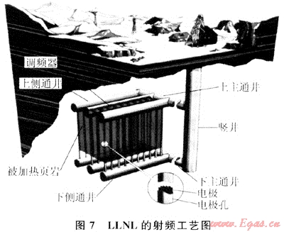 1970年代后期美國伊利諾理工大學提出利用射頻加熱油頁巖。該技術(shù)利用垂直組合電極緩慢加熱大規(guī)模深層的頁巖層。后來由Lawrence Livermore國家實驗室(LLNL)進行開發(fā)。LLNL提出利用無線射頻的方式加熱頁巖,克服了傳導加熱需要大量的熱擴散時間的缺點。具有穿透力強,容易控制等優(yōu)點(圖7)[12~14]。