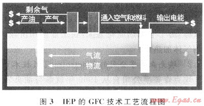 該工藝流程(圖3)為:利用高溫燃料電池堆的反應熱直接加熱油頁巖層,使其中的有機質(zhì)熱解產(chǎn)生烴氣,然后導入到采油井,被抽到地面上來。除了部分氣體作為燃料被通入燃料電池堆外,其余大部分烴氣經(jīng)冷凝后獲得石油和天然氣。另外,在啟動工藝裝置預熱油頁巖時期,需要向燃料電池中通入天然氣作為啟動燃料。工藝正常運轉(zhuǎn)后,能量自給自足[9]。