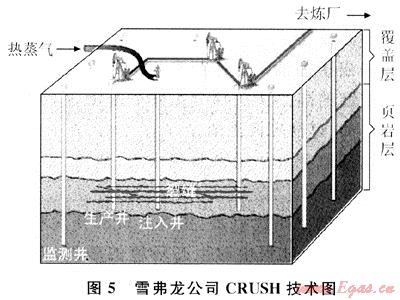 2006年,雪弗龍公司和Los Alamos國家實驗室聯(lián)合開發(fā)了CRUSH技術(shù),并將根據(jù)設計的含有2~5個四點井網(wǎng)單元的工業(yè)試驗模型,進行實驗室室內(nèi)實驗和小規(guī)模的現(xiàn)場試驗。目前主要研究注入高溫CO2加熱油頁巖層技術(shù)(圖5)。該技術(shù)首先對頁巖層進行爆破壓裂,提高CO2與干酪根接觸的表面積,將CO2以對流的方式從豎直井導入,通過一系列水平裂縫加熱頁巖層。生成的烴氣經(jīng)垂直井采出。該技術(shù)是基于1950年代Sinclair油氣公司利用垂直井間自然和引導的裂縫開采地下干酪根的試驗開發(fā)的[12]。康菲石油公司和阿克倫大學的研究表明:CO2是一種能使頁巖油很好回收的載體,并申請了專利[12]。該技術(shù)需要大量水,并進行現(xiàn)場生產(chǎn),對環(huán)境破壞較大[13]。