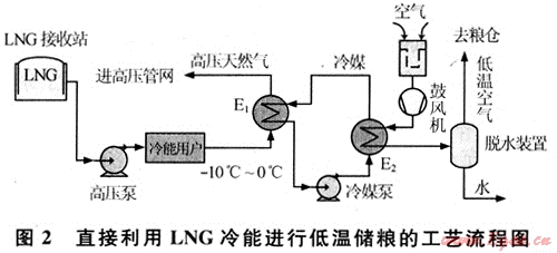 直接利用LNG的冷能來替代谷冷機生產(chǎn)冷空氣,工藝流程如圖2所示。LNG從接收站的大罐中抽出,然后經(jīng)高壓泵增壓至7.0~8.0MPa。按照“溫度對口,梯級利用”的原則,先經(jīng)保溫管線將LNG用于冷能用戶,溫度升高到0℃左右的天然氣用于低溫儲糧。在糧庫內(nèi)冷媒經(jīng)換熱器E1與天然氣換熱,天然氣溫度超過5℃后進入高壓天然氣管網(wǎng);冷媒從10℃左右降溫到5℃左右,通過冷媒泵輸送到換熱器E2中和增壓的空氣換熱,冷媒釋放出冷能后通過管線輸送回E1,空氣吸收冷媒的冷能后溫度降低,低于10℃后,經(jīng)過脫水裝置從塔底將水分離后獲得濕度適當?shù)牡蜏乜諝猓缓笸ㄈ爰Z倉中用于糧食的通風降溫,實現(xiàn)低溫儲糧。