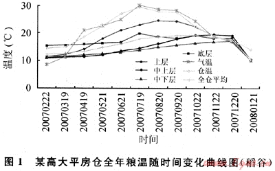 南方地區(qū)某高大平房倉(稻谷)冬季采用強制通風降溫后全年的氣溫、倉溫和全倉糧溫變化曲線如圖1所示。