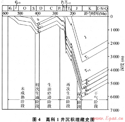 根據(jù)高科1井的沉積埋藏史圖(圖4)可見,樂山-龍女寺古隆起區(qū)下寒武統(tǒng)源巖經(jīng)歷了埋藏-抬升(剝蝕)-再埋藏-再抬升的演化過程。其有機質(zhì)生烴史可分為三期:第一期為初始生烴階段:高科1井下寒武統(tǒng)源巖在志留紀(jì)末R。值已達0.7%,處于未成熟一低成熟生烴期;第二期為生烴停滯階段,由于加里東運動的抬升作用,該井下寒武統(tǒng)源巖埋深變淺并遭受剝蝕,古地溫降低,有機質(zhì)進入生烴滯流階段;第三期為“二次生烴”階段:從二疊系開始至二疊系末,下寒武統(tǒng)源巖埋藏深度及其所具有的古地溫已超過了初始生烴階段,源巖進入了二次生烴階段。此時,高科1井毛。源巖Ro值已達0.71%,有機質(zhì)開始繼續(xù)生烴。印支末期,高科1井