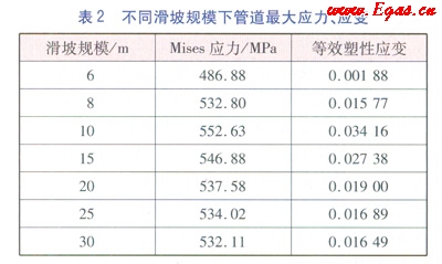計(jì)算滑坡規(guī)模分別為6m、8m、10m、15m、20m、25m和30m工況下管道的最大Mises應(yīng)力和最大等效塑性應(yīng)變(見(jiàn)表2),隨著滑坡規(guī)模的不斷擴(kuò)大,管道沿滑坡體滑動(dòng)方向的應(yīng)力、應(yīng)變逐漸增加,當(dāng)滑坡規(guī)模達(dá)到一定程度后,管道的應(yīng)力、應(yīng)變趨于穩(wěn)定并開(kāi)始降低。該現(xiàn)象可以解釋當(dāng)滑坡規(guī)模較大時(shí),管道的彎曲程度減緩,使得彎曲應(yīng)力降低,一定程度上減小了組合應(yīng)力。