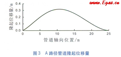 A路徑上各點(diǎn)的垂直方向隆起位移量見(jiàn)圖3(其中A點(diǎn)為坐標(biāo)原點(diǎn),C點(diǎn)位于管道軸向位置25m處),可見(jiàn)管道受滑坡體作用發(fā)生隆起,且最大隆起位移位于管道中下部,即B點(diǎn)偏下位置,這是因?yàn)楣艿老路绞艿降耐馏w壓力比上方大引起的。
