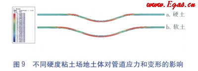 為分析滑坡兩側(cè)場(chǎng)地土體的影響,以滑坡規(guī)模20m為例,其他計(jì)算參數(shù)不變,分別計(jì)算硬土和軟土條件下管道的受力情況,硬土和軟土的剪切強(qiáng)度分別取50kPa和35kPa,如圖9所示,當(dāng)場(chǎng)地土體為軟土(圖9-b)時(shí)管道橫向位移發(fā)生范圍較長(zhǎng)。