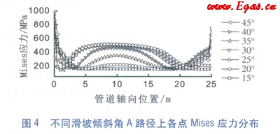 將滑坡規(guī)模固定為25m,滑坡傾斜角分別為15°、20°、25°、30°、35°、40°和45°,A路徑上各點(diǎn)的Mises應(yīng)力值見(jiàn)圖4。不同傾斜角下,管道的應(yīng)力集中區(qū)均為管道兩端和中下部。但隨著滑坡傾斜角的增加,管道的三個(gè)應(yīng)力集中區(qū)范圍逐漸增大,特別是管道中段的應(yīng)力集中區(qū)向兩端延伸,且最大應(yīng)力值也隨之增加。