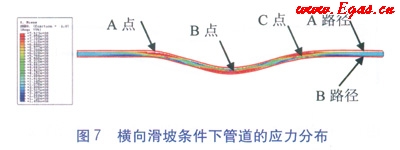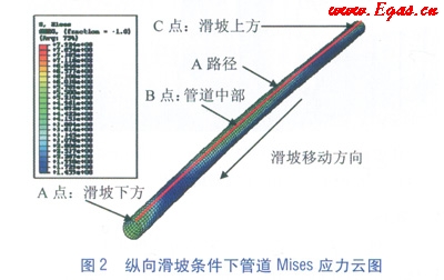 模型中滑坡體取粘土,土體剪切強(qiáng)度為50kPa,滑坡傾斜角為30°,滑坡規(guī)模為25m。以輸油管道為例,管道外徑為711mm,壁厚為10.3mm,管道材質(zhì)為X70鋼,管道內(nèi)壓8MPa,管道埋深1.8m,管—土間的摩擦系數(shù)為0.65。在ABAQUS軟件中繪制出管道的Mises應(yīng)力云圖(見(jiàn)圖2,單位為MPa),并沿管道軸向在管道上取A點(diǎn)、B點(diǎn)、C點(diǎn)和經(jīng)過(guò)以上三點(diǎn)的A路徑為參考位置和分析對(duì)象。