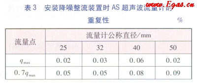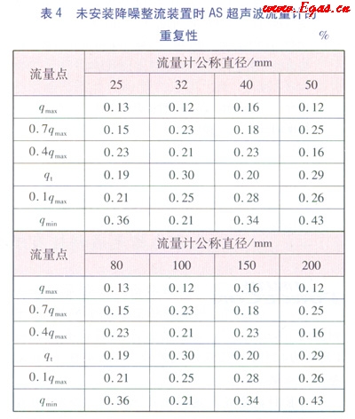 據(jù)國(guó)家質(zhì)量監(jiān)督檢驗(yàn)檢疫總局發(fā)布的超聲波標(biāo)準(zhǔn)JJG 1030—2007《超聲流量計(jì)》的要求,的重復(fù)性不能超過(guò)相應(yīng)準(zhǔn)確度等級(jí)規(guī)定的最相對(duì)誤差絕對(duì)值的1/5,即作為1.5級(jí)的AS流量計(jì)的重復(fù)性,除分界流量點(diǎn)(qt)以下的應(yīng)滿足重復(fù)性≤0.6%外,其他流量點(diǎn)應(yīng)滿足≤0.3%。流量計(jì)的重復(fù)性越小,性能越好。析表3和表4中的數(shù)據(jù),安裝降噪整流裝置的As超聲波流量計(jì)的重復(fù)性比不安裝降噪整流裝置的超聲波流量計(jì)的重復(fù)性要小很多,達(dá)到0.5級(jí)AS超聲波流量計(jì)的重復(fù)性的要求。試驗(yàn)證明降噪整流裝置的整流效果在超聲波流量計(jì)的重復(fù)性方面也能體現(xiàn)。