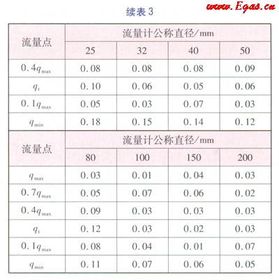 試驗(yàn)的方法為:在標(biāo)準(zhǔn)表校驗(yàn)裝置上被檢表的位置安裝好待測(cè)的儀器后,按照校驗(yàn)流量計(jì)的方法分別對(duì)qmin、0.1qmax、qt、0.4qmax、0.7qmax和qmax的流量點(diǎn)進(jìn)行校驗(yàn)。qmin為流量計(jì)的標(biāo)稱最小流量;qmax為流量計(jì)的標(biāo)稱最大流量;qt為分界流量,即流量范圍被分割成“高區(qū)”和“低區(qū)”的分界點(diǎn)的流量,“高區(qū)”的準(zhǔn)確度等級(jí)為流量計(jì)的標(biāo)稱準(zhǔn)確度等級(jí),“低區(qū)”的準(zhǔn)確度等級(jí)為流量計(jì)的標(biāo)稱準(zhǔn)確度等級(jí)的2倍。