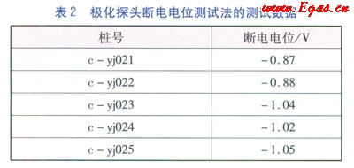 極化探頭[2]的極化試片在充分極化后,斷掉陰極保護電流,極化試片上的土壤IR降(陰極保護電流產生的IR降和雜散電流產生的IR降)瞬間等于零,在0.5s內讀取的數(shù)據(jù)為管道的斷電電位(測試數(shù)據(jù)見表2)。這樣不僅能消除陰極保護電流產生的IR降,還能消除雜散電流產生的IR降,能得到管道真實的陰極保護電位。本方法適用于受雜散電流干擾或無法同步中斷陰極保護電流的管道,尤其適用于犧牲陽極陰極保護的城鎮(zhèn)燃氣管道的測試。