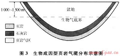 目前發(fā)現(xiàn)的生物成因型頁巖氣藏分兩類:①早成型,氣藏的平面形態(tài)為毯狀,從頁巖沉積形成初期就開始生氣,頁巖氣與伴生地層水的絕對年齡較大,可達(dá)66Ma,如美國Williston盆地上白堊統(tǒng)Carlile頁巖氣藏;②晚成型,氣藏的平面形態(tài)為環(huán)狀(圖3),頁巖沉積形成與開始生氣間隔時間很長,主要表現(xiàn)為后期構(gòu)造抬升埋藏變淺后開始生氣,頁巖氣與伴生地層水的絕對年齡接近現(xiàn)今,如美國Michigan盆地的Antrim頁巖氣藏[7]。生物成因型頁巖氣藏以Antrim頁巖氣藏最有代表性。