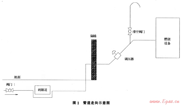 管道概況:新建管道長(zhǎng)約200m,設(shè)計(jì)壓力為0.4MPa。從一支線閥門井用de110的PE管道接出后埋地鋪設(shè),途中從一地下磚制煙道下方下翻穿越,之后穿出地面改為DN100鋼制管道進(jìn)入車間,經(jīng)調(diào)壓、計(jì)量后接入燃燒設(shè)備(圖1)。管道建成后經(jīng)過空氣強(qiáng)度和氣密性試驗(yàn)合格。