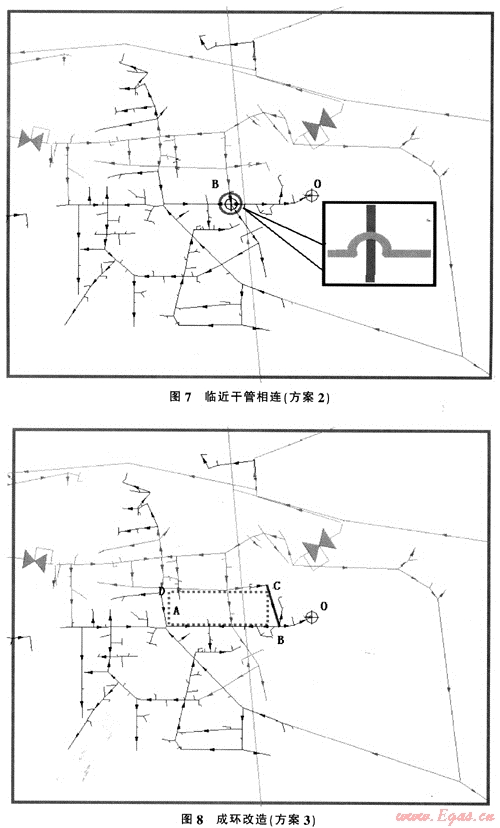 通過案例分析可以看出,最好的方案是管線相交處或相鄰處管線連接起來,其次是管網(wǎng)成環(huán),并行干管最差。但選擇哪種改造方案還要根據(jù)實際施工條件來確定。一般來說,應(yīng)首先采用連通線增設(shè)和成環(huán)改造方案,可使其效益最大化。