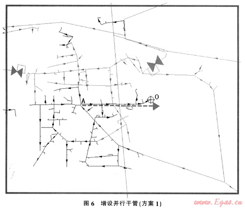 若沿原有供氣干線增設(shè)供氣管線,如圖6所示:從A點到B點大約需3km的管線??墒构芫€末端壓力增至0.138MPa。