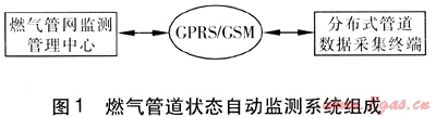 燃?xì)夤艿罓顟B(tài)自動監(jiān)測系統(tǒng)包括監(jiān)測管理中心、GPRS/GSM(GPRS為通用分組無線業(yè)務(wù),GSM為全球移動通信系統(tǒng))、分布式管道數(shù)據(jù)采集終端,系統(tǒng)組成見圖1。