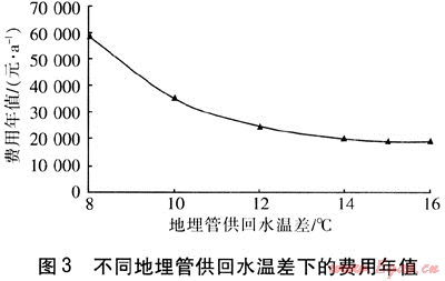 當(dāng)?shù)責(zé)嶝?fù)荷比例為80%、地埋管外徑為25mm時(shí),對(duì)地埋管供回水溫差進(jìn)行優(yōu)化。不同地埋管供回水溫差下的費(fèi)用年值見圖3。由圖3可知,費(fèi)用年值在地埋管供回水溫差為15℃時(shí)最小。通過設(shè)計(jì)參數(shù)優(yōu)化設(shè)計(jì)可知,當(dāng)?shù)責(zé)嶝?fù)荷比例為80%、地埋管供回水溫差為15℃、地埋管外徑為25mm時(shí),地?zé)崴疁厥夜嵯到y(tǒng)的經(jīng)濟(jì)性最好。