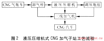 液壓壓縮機式CNG加氣子站是利用液壓壓縮機從氣瓶車中吸氣,加壓后通過站內的三線雙槍加氣機把高壓天然氣充入CNG汽車的車載儲氣瓶內,達到給汽車加氣的目的。