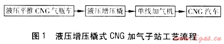 液壓增壓橇式CNG加氣子站是利用液壓泵將一種特殊性質的液體加壓至20~22MPa,然后將高壓液體充入液壓平推CNG氣瓶車的儲氣鋼瓶中,將鋼瓶內的壓縮天然氣推出,再通過站內的單線雙槍加氣機把高壓天然氣充入CNG汽車的車載儲氣瓶內,達到給汽車加氣的目的,不需采用其他增壓設備[1]。