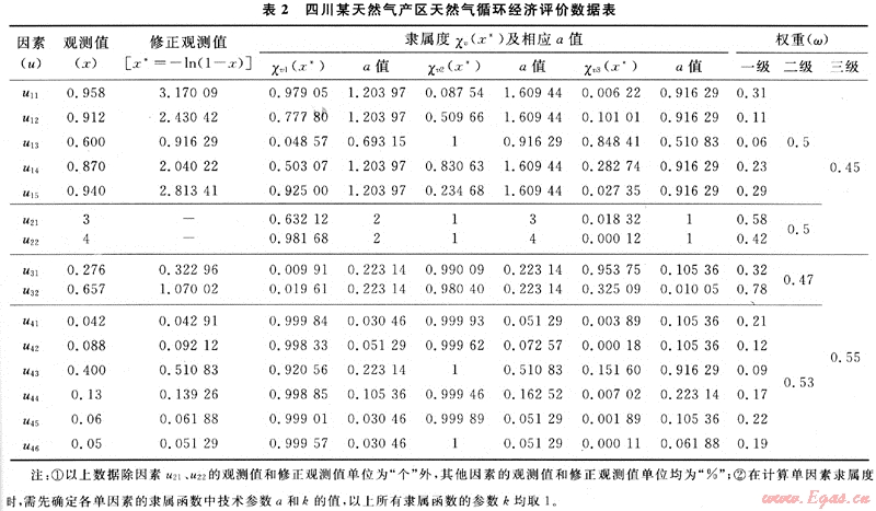 以四川某天然氣產區(qū)為例,通過到天然氣生產企業(yè)和相關政府部門調研討論,并依據(jù)各單因素指標數(shù)據(jù)以及各指標權重,計算各方面數(shù)據(jù),整理如表2。