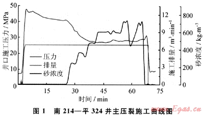 由于炮眼磨損引起的施工壓力變化在限流法壓裂施工曲線中有很明顯的顯示,圖1是南214-平324井的主壓裂施工曲線,從圖中可以看出支撐劑到達(dá)井底后,井口壓力大幅度下降,這在其他壓裂方式中是沒(méi)有的現(xiàn)象。此現(xiàn)象是由于支撐劑加入引起的混砂液凈液柱壓力、管柱摩阻和孔眼摩阻的變化綜合作用的結(jié)果。根據(jù)南214-平324井的井身結(jié)構(gòu)及施工情況定量計(jì)算出前兩項(xiàng)的值[6~7],可以發(fā)現(xiàn)它們對(duì)施工壓力的影響遠(yuǎn)沒(méi)有這么大,因此可以判斷出現(xiàn)施工壓力如此大幅度降低的主要原因是孔眼受支撐劑打磨孔徑變大后,摩阻急劇降低造成的,但目前的壓裂設(shè)計(jì)軟件還不能模擬孔眼摩阻的動(dòng)態(tài)變化對(duì)裂縫形態(tài)的影響。