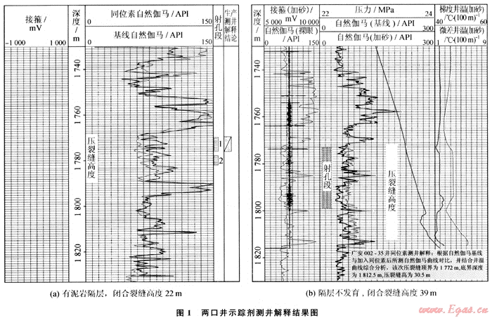 在壓裂施工中加入示蹤劑,通過壓后井溫度測井和示蹤劑確定縫口裂縫高度。通過對裂縫高度測量,可以對泥巖隔層的遮擋性和儲層裂縫高度延伸規(guī)律進行研究,進一步優(yōu)化壓裂設計,與壓裂數(shù)據(jù)共同分析,確定裂縫有效幾何形態(tài)(圖1)。