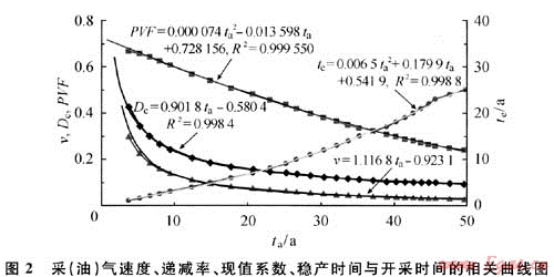 根據(jù)圖1模式生產(chǎn),以目前通用的石油行業(yè)基準(zhǔn)收益率12%作為貼現(xiàn)率(ic),那么系數(shù)j=0.11333。通過理論計(jì)算,可以得出圖2所示的采(油)氣速度、遞減率、現(xiàn)值系數(shù)、穩(wěn)產(chǎn)時(shí)間與總生產(chǎn)時(shí)間的相關(guān)曲線。