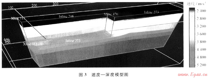 采用均方根速度轉(zhuǎn)換方法估算層速度與相干反演相結(jié)合的方法進(jìn)行層速度模型的建立。通過疊前時間偏移迭代后,均方根速度模型比較準(zhǔn)確,在一定程度上符合地質(zhì)變化規(guī)律。對于水平層狀或單傾的介質(zhì),均方根速度模型轉(zhuǎn)換的方法能得到較好的初始模型,并通過層析成像模型優(yōu)化能得到精確的速度模型。對于地層傾角變化較大、速度不均一的復(fù)雜斷塊,簡單的速度轉(zhuǎn)換方法不能合理地描述速度結(jié)構(gòu)。采用相干反演法與均方根速度轉(zhuǎn)換法聯(lián)合建立層速度模型,相互驗證速度的合理性精度更高。通過分析沿層剩余速度,利用三維層析成像技術(shù)修改層速度模型優(yōu)化地質(zhì)模型,建立最優(yōu)速度-深度模型剛(圖3)。