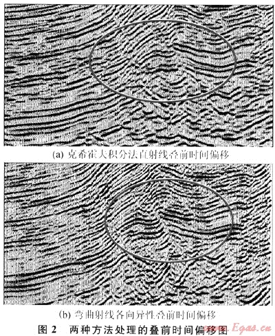 克希霍夫積分法疊前時間偏移,考慮了復(fù)雜陡傾界面的地層傾角及反射點彌散問題,能部分適應(yīng)速度在縱橫向的變化[4]。由于沒有考慮射線彎曲,所以在速度縱向變化較時偏移效果不理想彎曲射線各向異性疊前時間偏移,由于它考慮了成像射線的彎曲及速度各向異性,更符合地下實際,成像效果明顯優(yōu)于直射線疊前時間偏移,在斷層成像、斷塊劃分能力以及目的層內(nèi)幕反射特征上有很大的改善(圖2)。