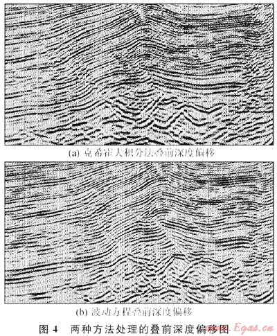 三維疊前深度偏移方法主要采用克希霍夫積分法,優(yōu)點是計算效率高,對野外觀測無任何限制適應(yīng)能力強(qiáng),且能較好的適應(yīng)大傾角偏移,具有抗假頻能力;缺點是射線多路徑問題、焦散、振幅保真處理問題和分辨率低等。研究人員通過兩種途徑來解決不足:①對現(xiàn)有的克?;舴蚍ㄔ诼眯袝r計算和偏移方法方面進(jìn)行改進(jìn),如從首波旅行時計算向基于波前重建的旅行時計算,其中考慮了多個射線,并且是利用體波旅行時、相對保幅處理和基于模型的孔經(jīng)定義等,改進(jìn)后的成像結(jié)果其構(gòu)造細(xì)節(jié)更加清楚可靠;②發(fā)展新的偏移方法,借助于高性能的PC-CLUSTER微機(jī)集群,采用波動方程偏移方法,其成像結(jié)果更好。圖4可看出波動方程疊前深度偏移在深層斷點歸位準(zhǔn)確、振幅頻率保持較好,成像精度更高[6]。