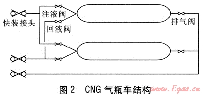 本文中的CNG氣瓶車是在普通CNG氣瓶車基礎(chǔ)上改裝而成的,其結(jié)構(gòu)見圖2。每輛CNG氣瓶車都有8個儲氣瓶,為了簡化圖形,圖中只畫出2個儲氣瓶。儲氣瓶兩端的注液閥、回液閥和排氣閥都是常閉型氣動球閥,向氣動球閥的氣缸充壓縮空氣則氣動球閥開啟;氣缸泄氣則氣動球閥關(guān)閉。