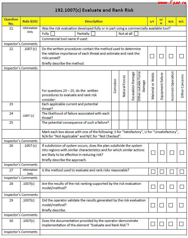 由PHMSA于2011年9月制定和發(fā)布。用于檢查和評(píng)價(jià)燃?xì)膺\(yùn)營(yíng)企業(yè)開(kāi)展完整性管理情況,檢查手冊(cè)(示例見(jiàn)圖 5)以表格和提問(wèn)形式進(jìn)行檢查。對(duì)于問(wèn)題的回答有S/Y、U/N和N/A三種形式,其中S/Y表示是或者滿(mǎn)足條件,U/N表示不是或者不滿(mǎn)足條件,N/A表示標(biāo)準(zhǔn)不適用或者未進(jìn)行檢查。燃?xì)馄髽I(yè)也可利用該檢查手冊(cè)進(jìn)行自檢,以完善其完整性管理水平。