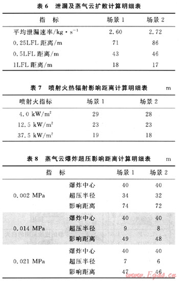 各場景泄漏、擴散、火災(zāi)和蒸氣云延遲爆炸的計算結(jié)果見表6~8。