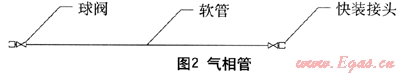 圖2為氣相管路,主要實(shí)現(xiàn)事故槽車、卸車壓縮機(jī)和搶險(xiǎn)槽車的連接,主要由球閥、軟管和快裝接頭組成。由于設(shè)備及槽車所用快裝接頭皆為陽(yáng)接頭,故軟管上所配接頭采用陰接頭。