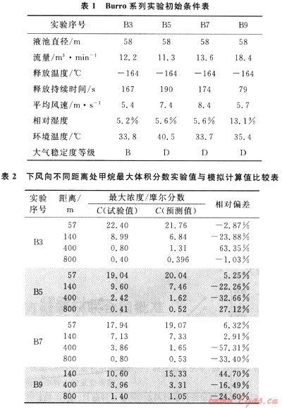 本文研究的數(shù)學(xué)模型通過Burro系列實(shí)驗(yàn)[1,5]進(jìn)行驗(yàn)證,Burro實(shí)驗(yàn)在距離泄漏源下風(fēng)向57m、140m、400m、800m處分別測得天然氣的最大體積分?jǐn)?shù)值,該實(shí)驗(yàn)共進(jìn)行了多組,本文對其中的3號、5號、7號和9號實(shí)驗(yàn)進(jìn)行模擬,將實(shí)驗(yàn)數(shù)據(jù)與模型計(jì)算結(jié)果對比,并進(jìn)行誤差分析,得出模型計(jì)算的平均相對偏差為24.28%。實(shí)驗(yàn)的初始條件以及對比結(jié)果見表1、2。