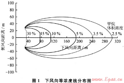 在LNG場站選址時,需要遠(yuǎn)離居民區(qū),以保證人民生命財(cái)產(chǎn)安全,因此,場站與居民區(qū)之間的距離是重要的考慮因素。LNG在泄漏過程中,自泄漏源開始,氣體濃度逐漸被稀釋,當(dāng)其體積濃度在5%~15%范圍內(nèi)(即甲烷的爆炸極限內(nèi)),存在發(fā)生火災(zāi)或者爆炸的可能性。為了確保間隔距離劃定的可靠性,相關(guān)標(biāo)準(zhǔn)(如NFPA59A),規(guī)定其下風(fēng)向體積濃度為2.5%處的距離為安全距離[4]。以Burro系列5號實(shí)驗(yàn)為例(以下簡稱B5),其下風(fēng)向上體積濃度的等濃度線見圖1,可以看出下風(fēng)向體積濃度5%和2.5%的最大距離差約為110m。以下用所建的計(jì)算模型,對氣體擴(kuò)散過程和安全距離的影響因素進(jìn)行分析。
