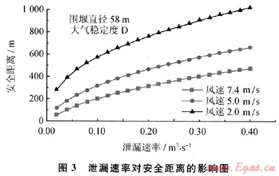 LNG儲罐周圍通常要設(shè)計(jì)圍堰,以防止儲罐發(fā)生泄漏時,液體四處流淌蔓延,若發(fā)生火災(zāi),還可以防止火焰蔓延到周邊地區(qū)[4]。LNG泄漏到圍堰內(nèi),會迅速蒸發(fā)氣化,形成以圍堰為二次源的蒸氣云團(tuán)擴(kuò)散。圖4給出下風(fēng)向安全距離隨著圍堰直徑和泄漏速率的變化。當(dāng)圍堰尺寸較小時,以圍堰為二次源云團(tuán)的范圍也較小,有限的蒸發(fā)氣受大氣湍流影響,其濃度較快稀釋,安全距離較?。划?dāng)圍堰尺寸過于增大時,二次源云團(tuán)的天然氣濃度較低,其下風(fēng)向擴(kuò)散距離不再增加,反而略有減少。