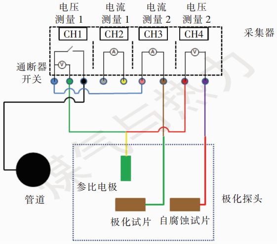 從圖1可以看出,極化試片通過棕色端子、粉色端子、藍(lán)色端子、通斷器開關(guān)以及黑色端子之間的電纜與管道連接(其中電流測(cè)量模塊2內(nèi)部的高精度電流表內(nèi)阻可忽略不計(jì))。測(cè)量管道通電電位時(shí),電壓測(cè)量模塊1內(nèi)部ms級(jí)電路控制模塊的通斷器開關(guān)合上,此時(shí)極化試片通過棕色端子、粉色端子、黑色端子之間的電纜與管道電連接,這就意味著極化試片與管道處于等電位狀態(tài),此時(shí)通過測(cè)量極化試片電纜與極化探頭的參比電極電纜之間電位差即可得到管道通電電位。測(cè)量極化電位時(shí),通過采集器內(nèi)部ms級(jí)電路控制模塊控制通斷器的開關(guān)處于斷開狀態(tài),并精準(zhǔn)控制極化試片與管道的斷開時(shí)間,此時(shí)極化試片由于通斷器開關(guān)斷開而與管道之間處于斷開的狀態(tài),利用采集器電壓測(cè)試模塊1測(cè)量斷電情況下極化試片電纜與極化探頭的參比電極電纜之間的電位差,即可獲得極化電位。測(cè)量自腐蝕電位時(shí),通過采集器內(nèi)部電壓測(cè)量模塊2測(cè)量極化探頭的自腐蝕試片電纜與極化探頭的參比電極電纜之間的電位差。測(cè)量直流電流密度(自腐蝕試片的面積數(shù)據(jù)已存儲(chǔ)在采集器中)時(shí),任意選用采集器內(nèi)部電流測(cè)量模塊1或者模塊2,圖1中是利用電流測(cè)量模塊2測(cè)量極化探頭內(nèi)極化試片與管道之間的直流電流密度。電流測(cè)量模塊2正極接粉色端子,粉色端子通過藍(lán)色端子、通斷器開關(guān)以及黑色端子之間的電纜與管道相連,電流測(cè)量模塊2負(fù)極接極化試片。這就相當(dāng)于電流測(cè)量模塊2一端接管道,一端接極化試片,通過電流測(cè)量模塊2即可測(cè)量極化試片與管道之間的直流電流密度,并且利用電流測(cè)量模塊同時(shí)可測(cè)量出極化試片與管道之間的交流電流密度。